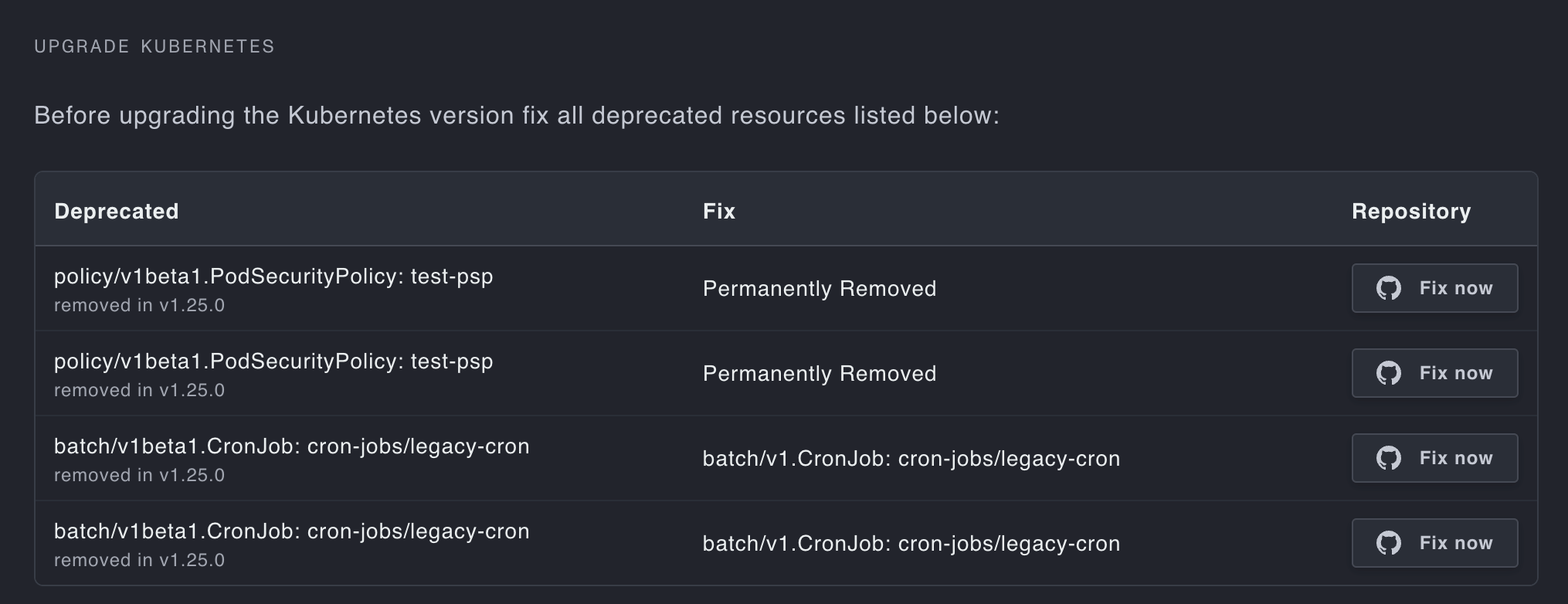 Plural will automatically surface deprecated resources detected on the cluster, and link to the location in Github for review.