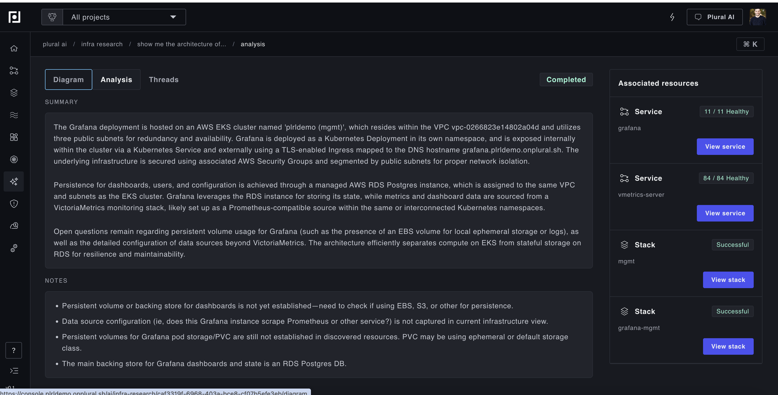 Diagram creation is simple and UI-based. Navigate to AI -> Infra Research. You'll have a prompt button to spawn a new research, and from there you'll see a few threads spawn in as the AI is working in the background. The process takes about 1-2 minutes, and is completely headless, so feel free to grab a coffee while its churning. Once done, you'll have a full result looking something like (using the prompt Show me the architecture of the grafana deployment):